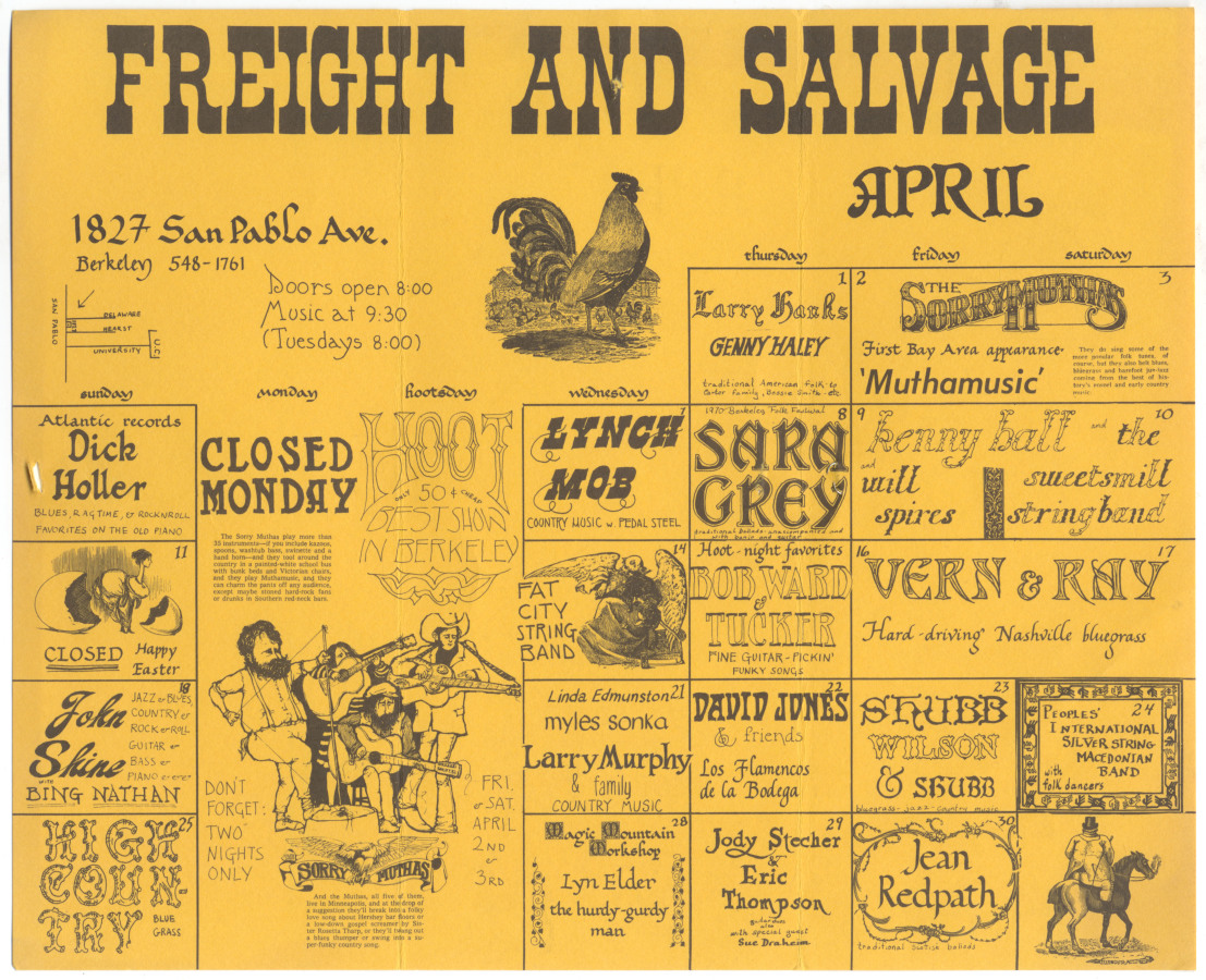 The Freight and Salvage has been a focal point of traditional music in Berkeley, California since 1968. In the 1970s, artist and musician Holly Tannen designed the Freight’s monthly calendar. Tannen’s calendars offer a glimpse of the concerts, dances, song circles, and hootenannies that comprised the Bay Area folk scene of the 1970s. The calendars also reveal design and typography trends of the scene, including the use of typefaces inspired by 19th-century American wood type.